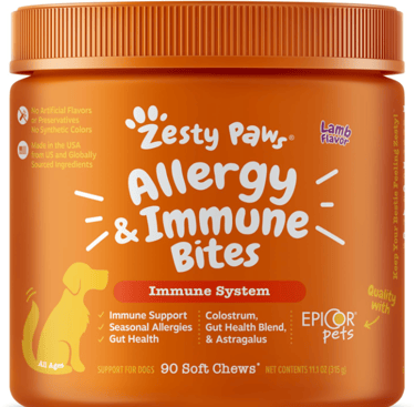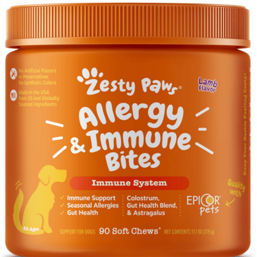 If your poor dog struggles with constant itching, paw gnawing, or seasonal allergies, Zesty Paws Allergy & Immune Bites may be just what they need. These tasty chews are packed with powerhouse ingredients like probiotics, omega-3s, and colostrum to support your pup’s immune system and skin health from the inside out.